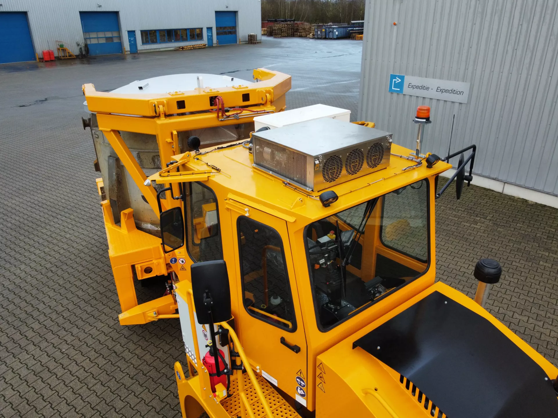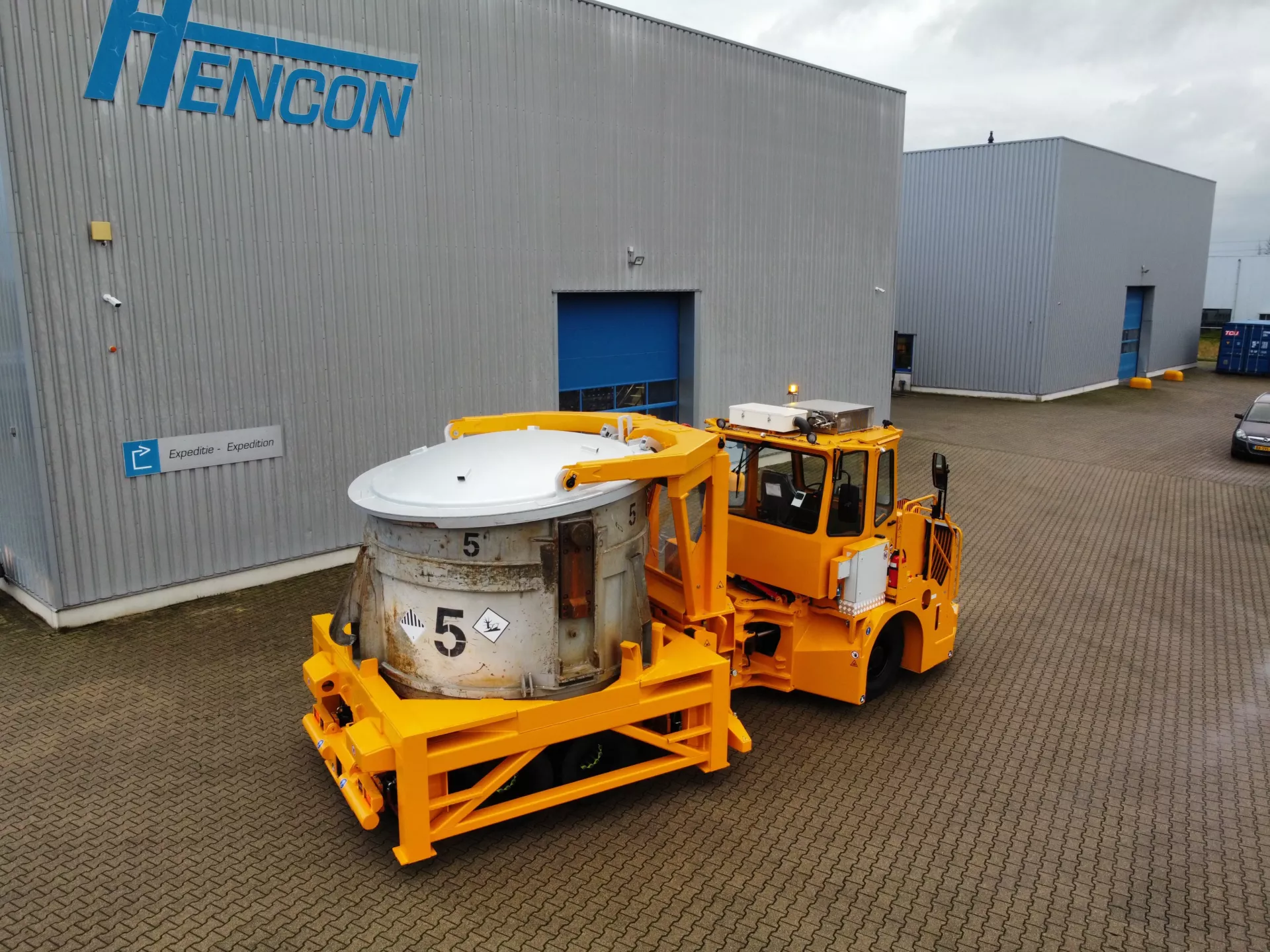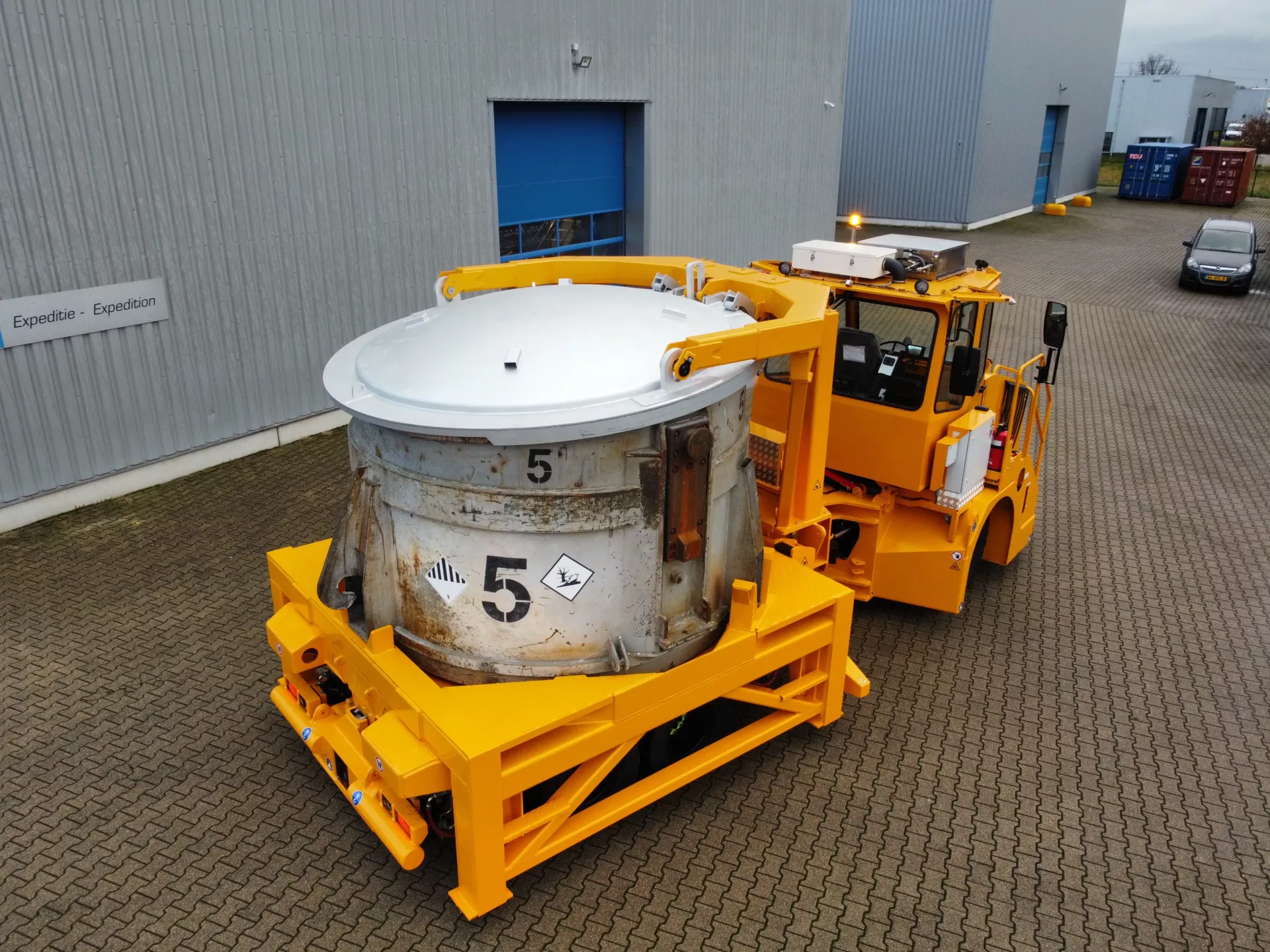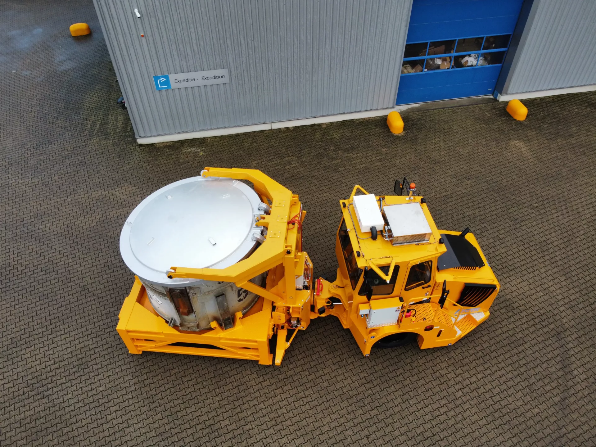 To protect the aluminium in the ladle from dirt or rain, a hydraulic operated cover is integrated in the trailer.